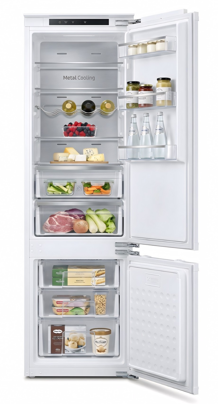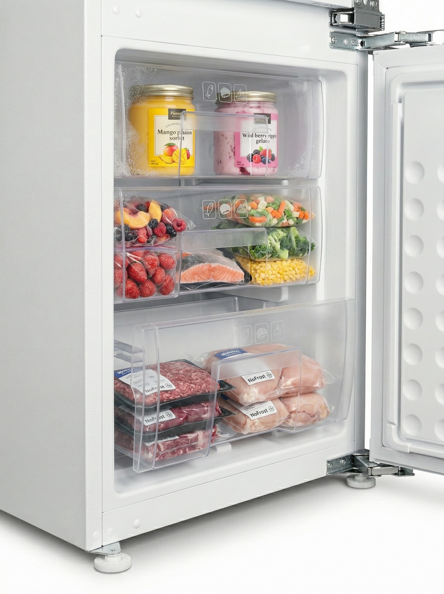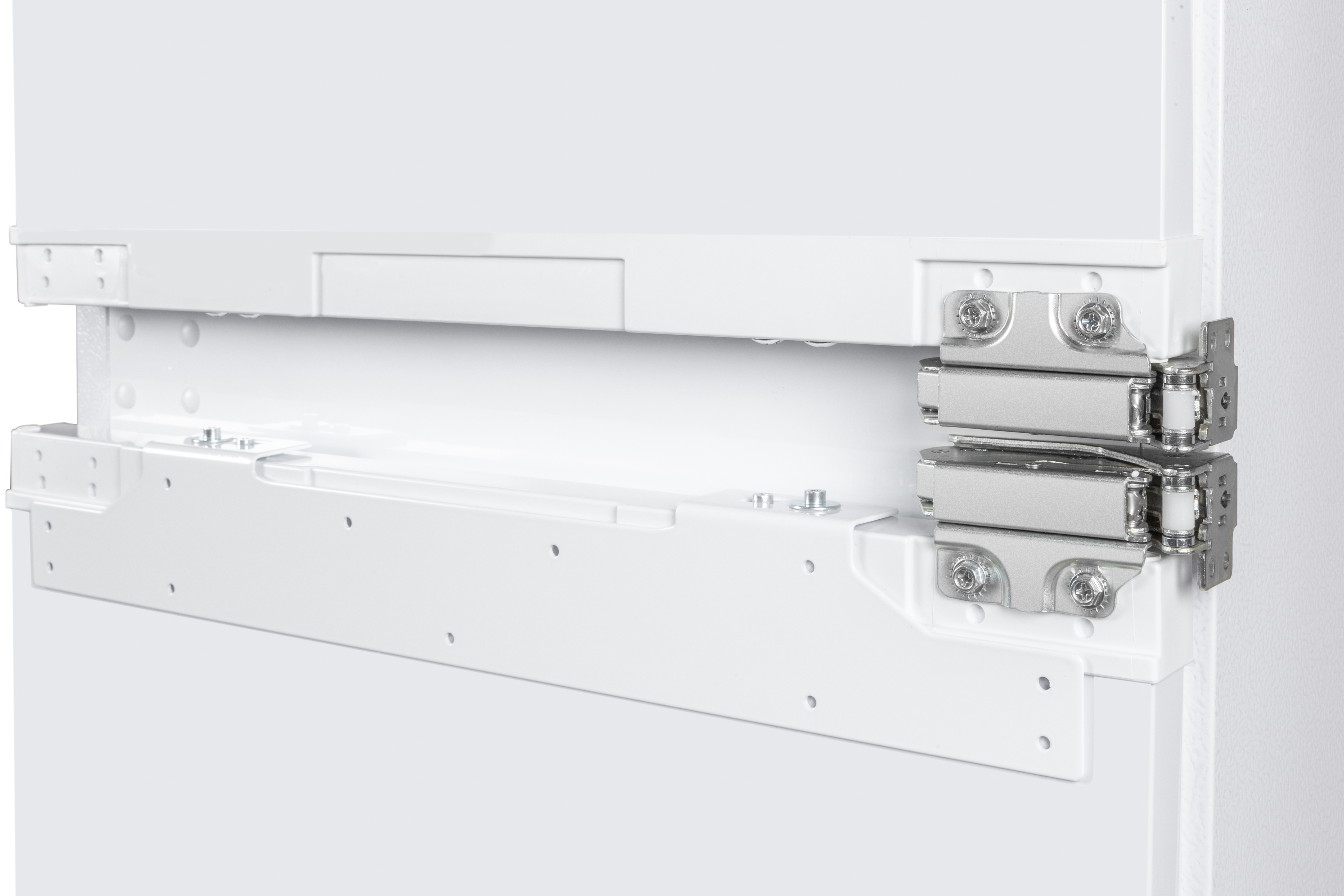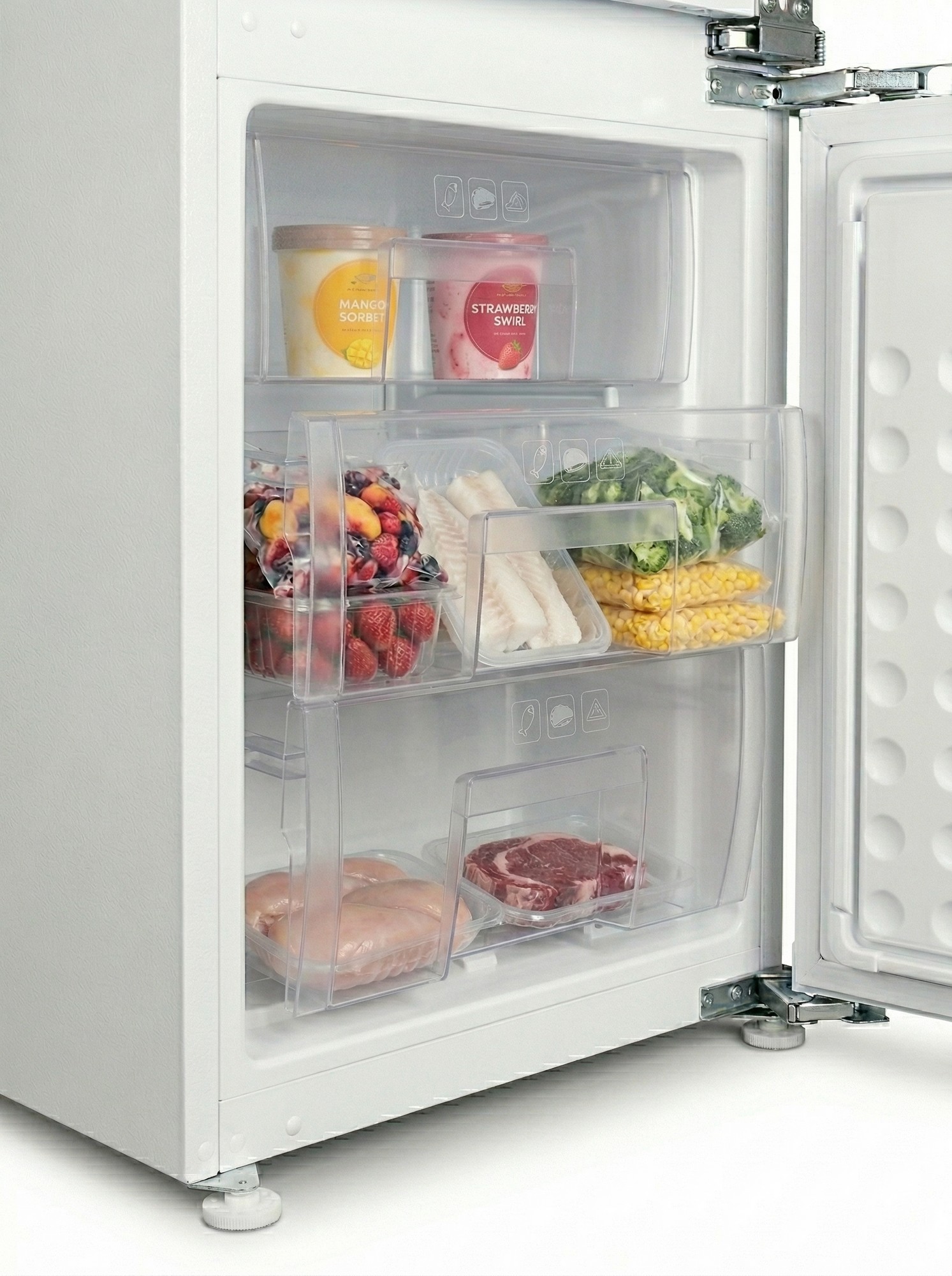 Особливість таких холодильників полягає в тому, що вони повністю приховуються за фасадами кухні. Техніка монтується в спеціальний короб, а її лицьова частина закривається декоративною панеллю в стилістиці гарнітура. Залишаючись непомітними оку, вбудовані холодильники ефективно виконують своє пряме призначення.